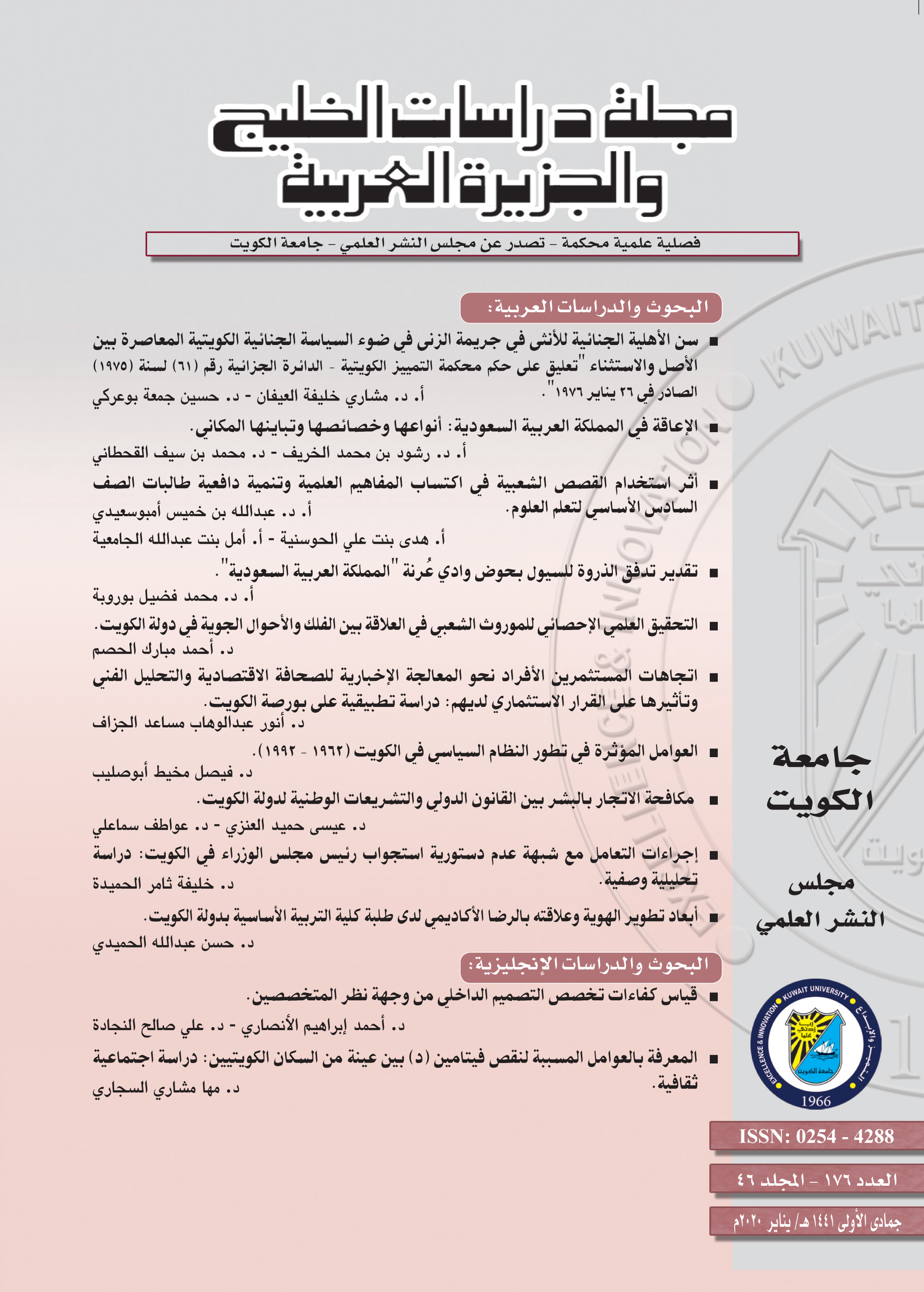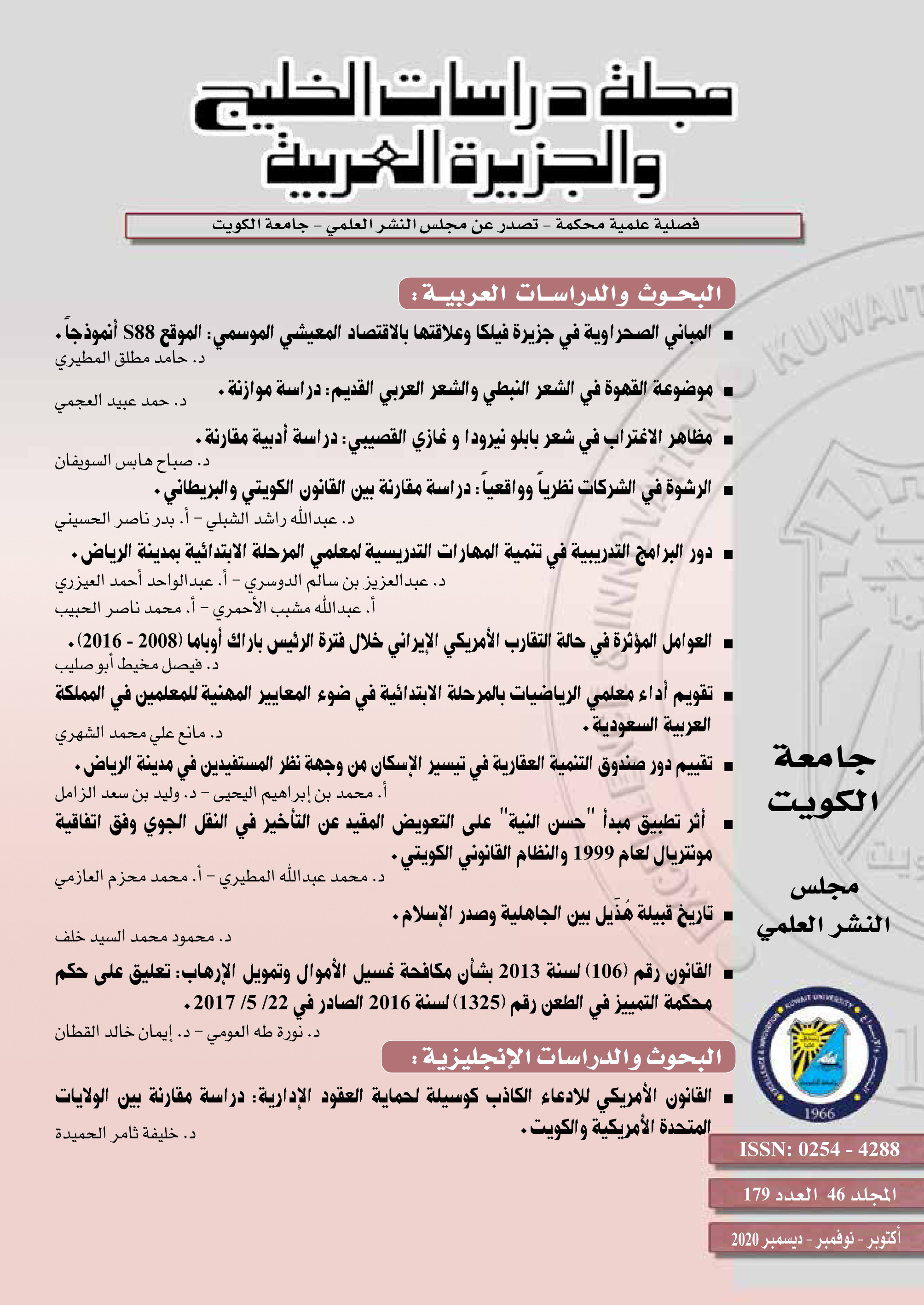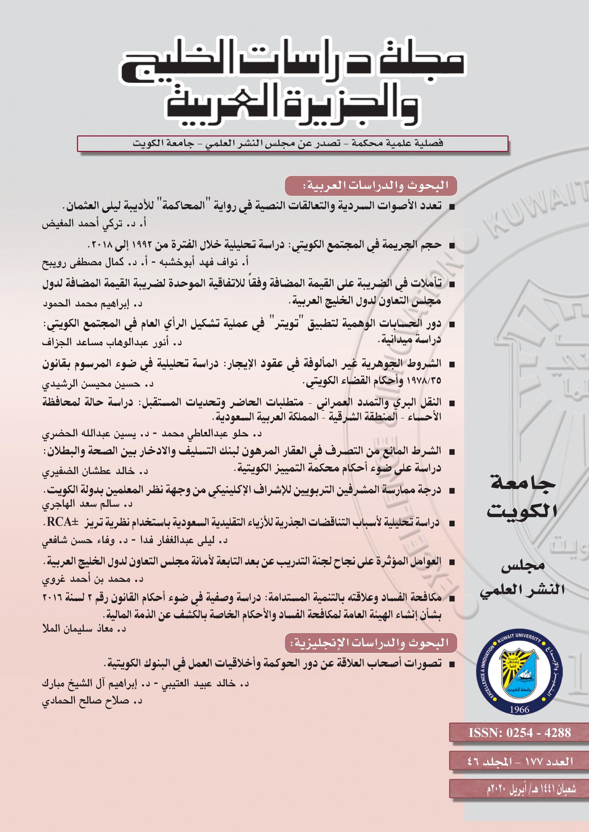 تناول العدد الحالي دراسة قانونية؛ إذ تبرز دراسة القلاف الفراغ التشريعي من تجريم إفشاء السرية في التشريع الجزائي الكويتي في ظل التكنولوجيا التي سهلت الاطلاع على أي مستند أو وثيقة أو سر من الأسرار المحمية، عن طريق النشر أو التصوير أو بأي وسيلة أخرى. توصلت الدراسة إلى وجود بعض النصوص القانونية المتفرقة في القوانين المهنية الخاصة ومدونات السلوك الوظيفي التي نصت على جزاءات تأديبية وجزائية على إفشاء السر المهني. كما تناول العدد دراسة تاريخية؛ إذ عالجت دراسة الوزان مسألة انتماء الشاعر الأموي الفرزدق إلى كاظمة بأرض الكويت، حاولت بذلك الاستدراك على الدراسات الحديثة التي أهملت توضيح هذه المسألة المرتبطة بتاريخ الكويت. تبين من الدراسة أن الفرزدق قد نشأ وعاش في المقر بكاظمة، هو وأسرته وفرعه القبلي، وأنه مرَّ بمناطق ما زالت بعضها معروفة بالاسم نفسه.