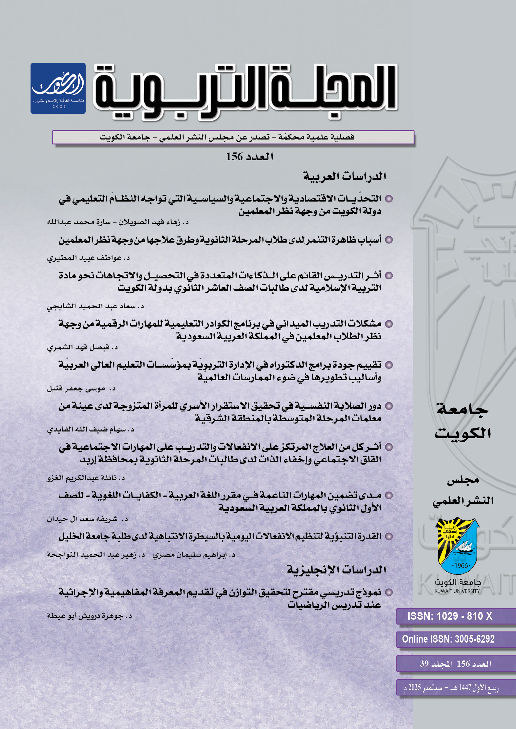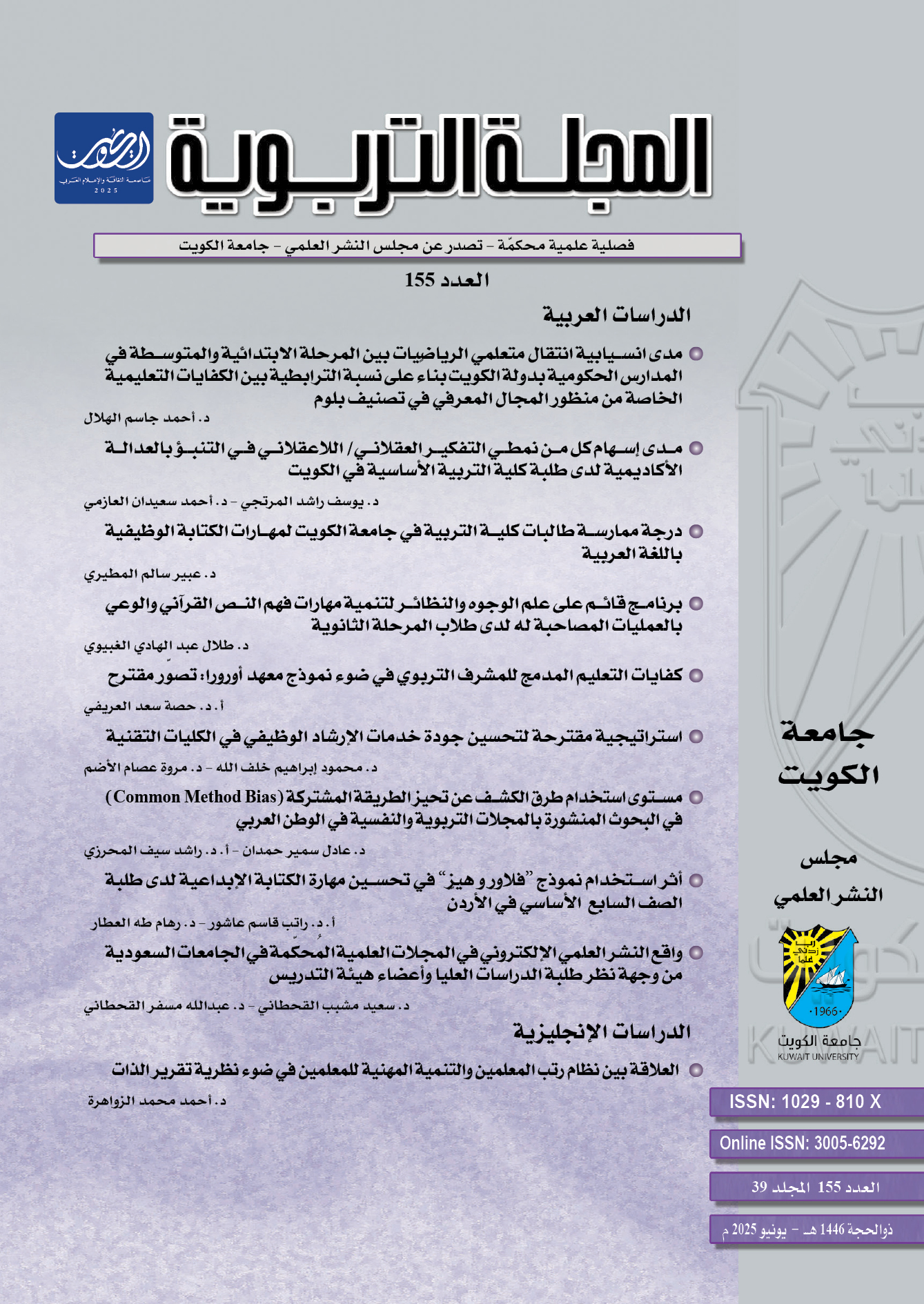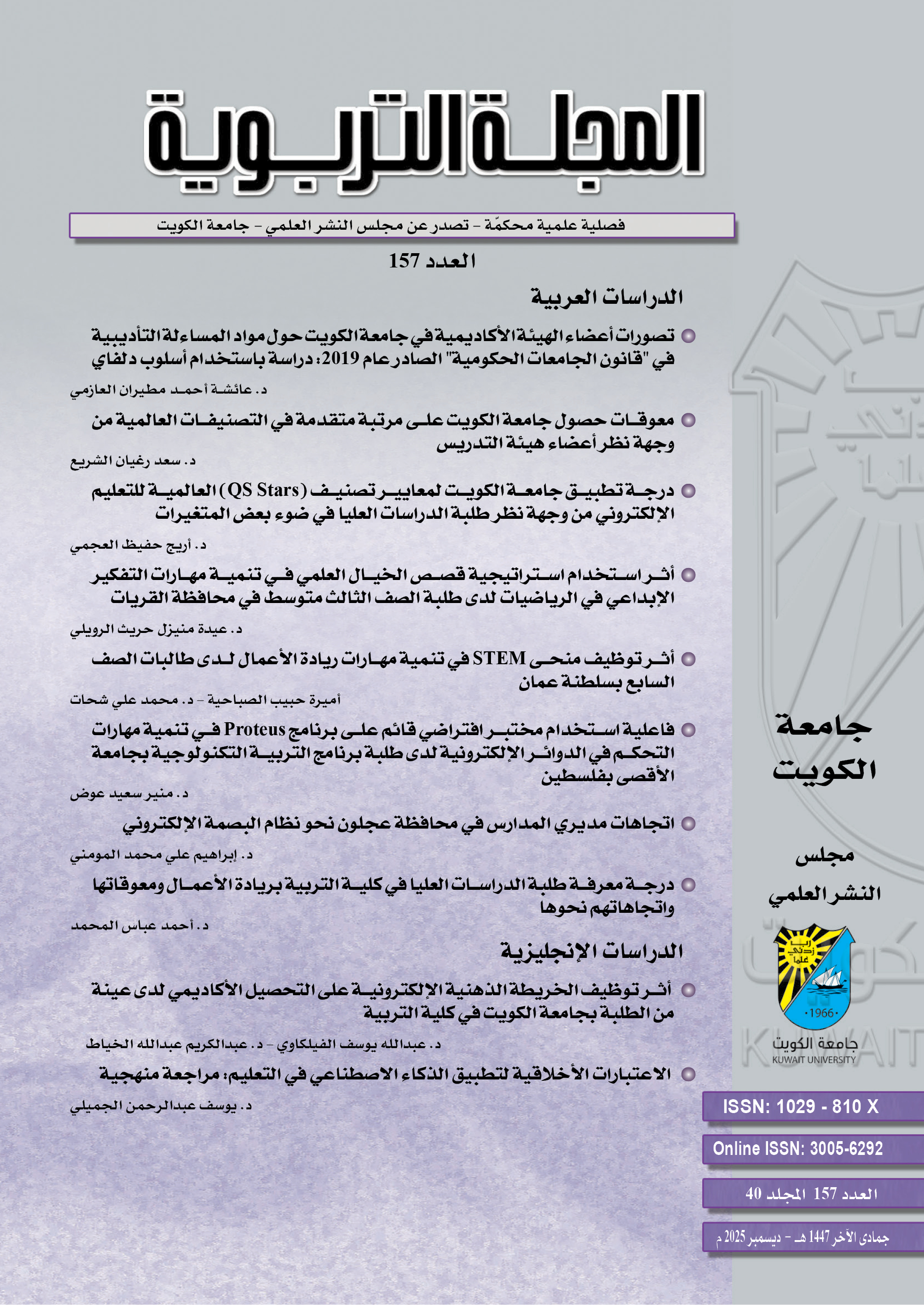 مجلد 40 عدد 158 (2026)جاء هذا العدد محملاً بمجموعة قيِّمة من الدراسات والبحوث التي تم تصميمها بطريقة علمية محكَّمة، استحقت عليه القبول للنشر في المجلة التربوية، والتي لا تزيد فيها نسبة قبول الأبحاث على 30% من عدد ما يصل إليها، استناداً إلى المعايير العلمية الصارمة التي تتبعها، بدءاً من مراجعة رئيس التحرير لعنوان الدراسة ومدى حداثته وارتباطه بالاتجاهات المعاصرة للتربية والتعليم، مروراً بطبيعة المنهجية المستخدمة، التي تبرهن على تمكن الباحثين من أساليب وأدوات البحث العلمية، وقدرتهم على تطبيقها على الظاهرة محل الدراسة.