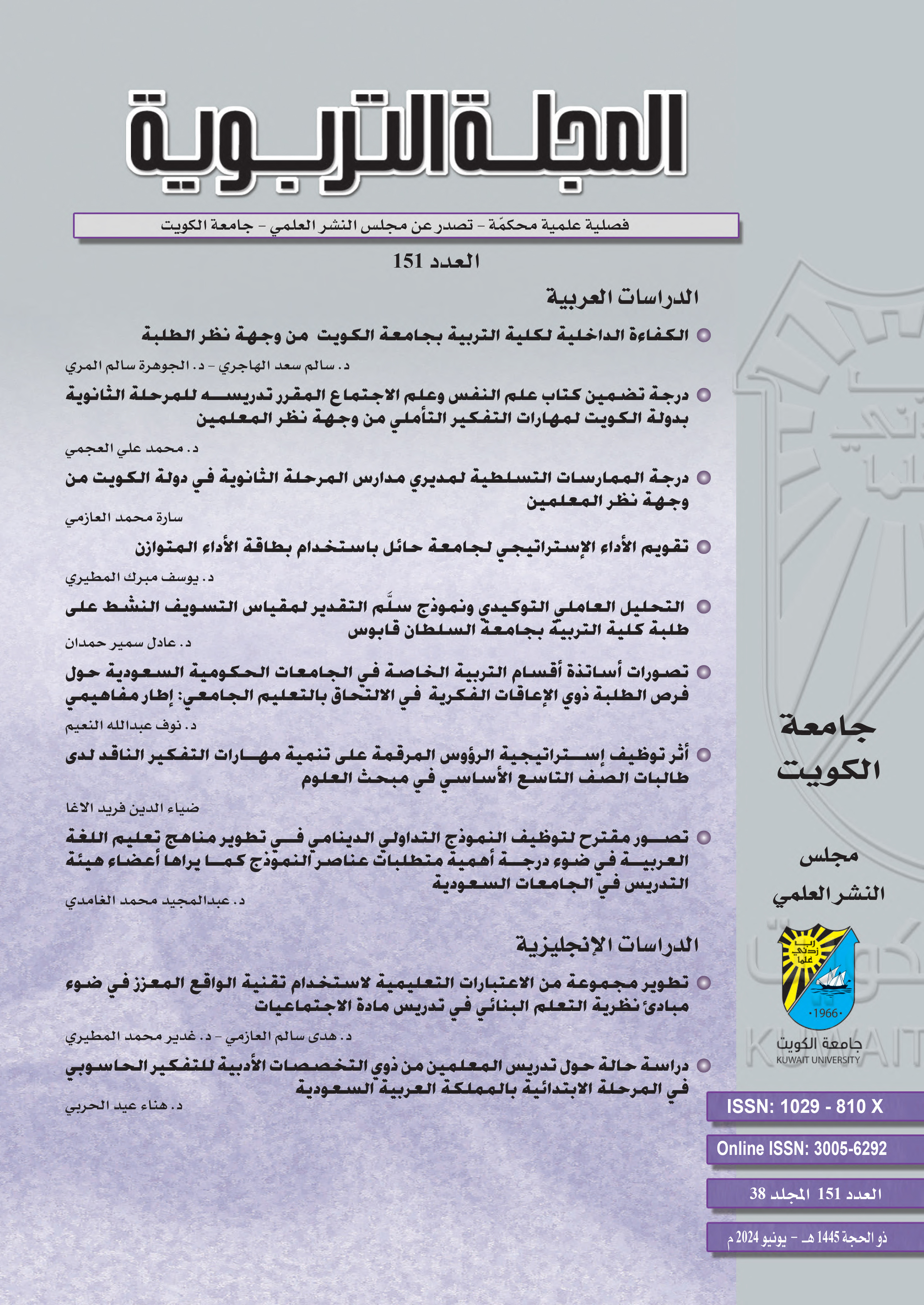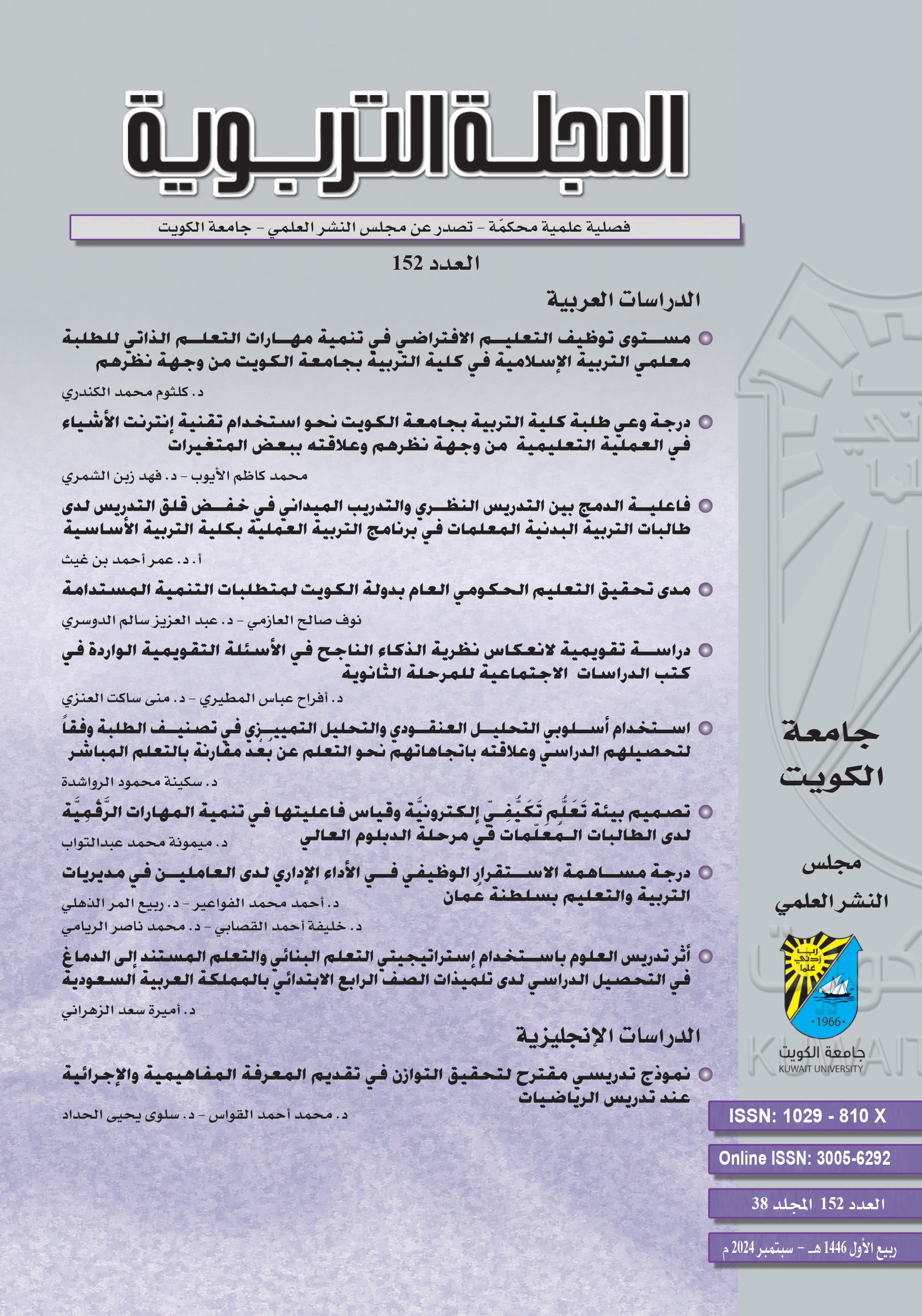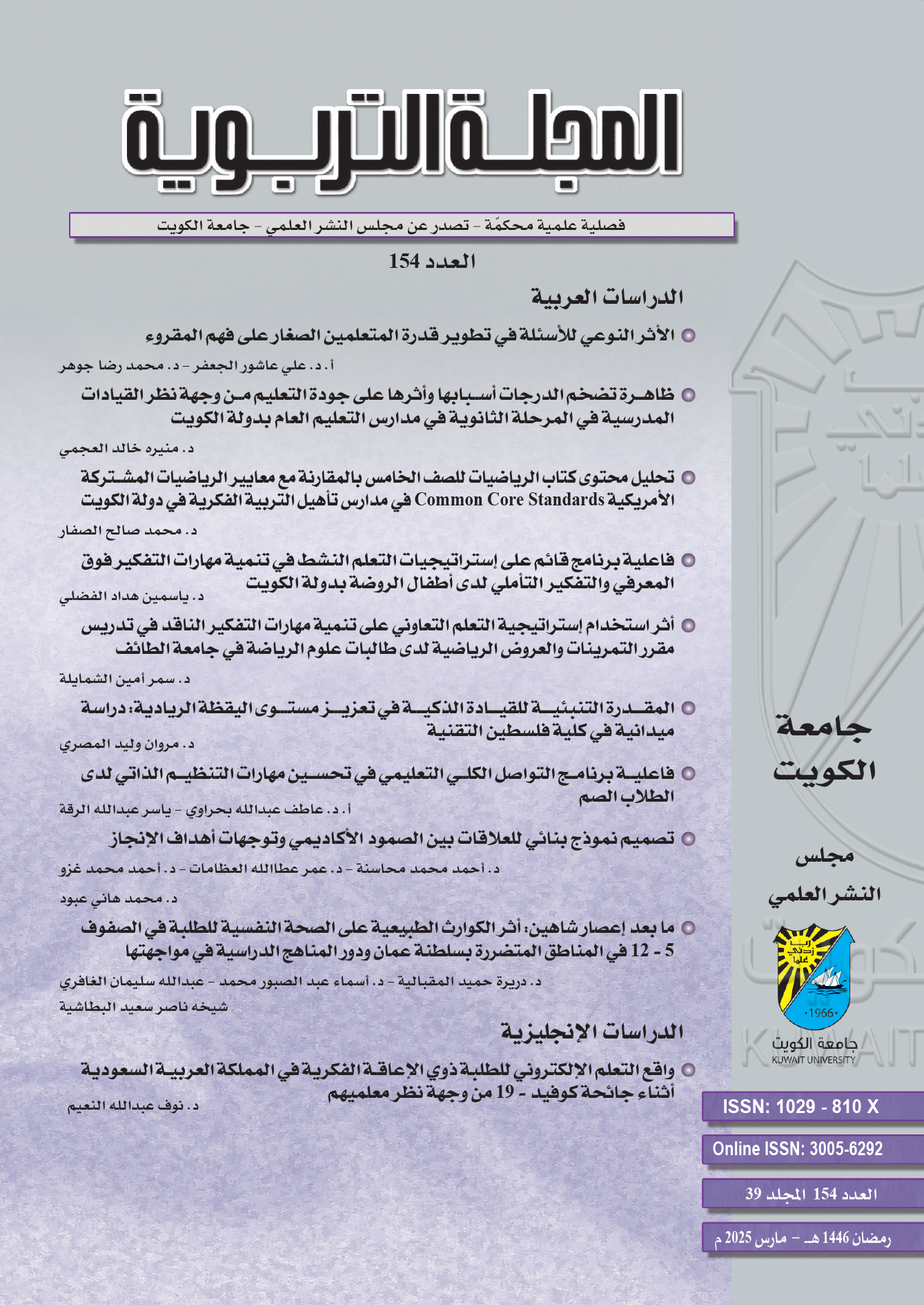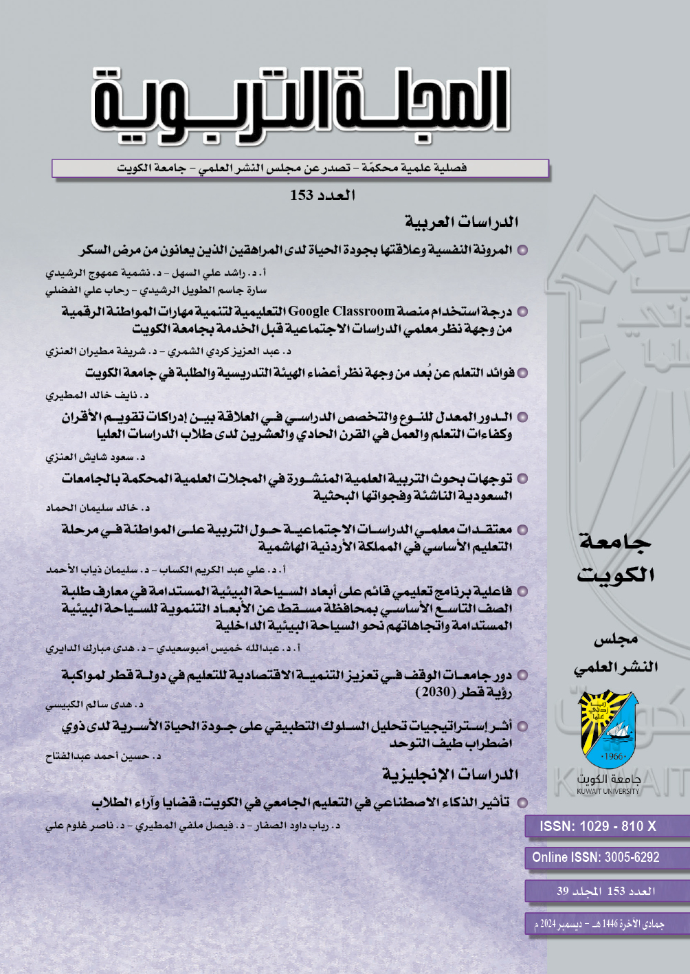 مجلد 40 عدد 158 (2026)جاء هذا العدد محملاً بمجموعة قيِّمة من الدراسات والبحوث التي تم تصميمها بطريقة علمية محكَّمة، استحقت عليه القبول للنشر في المجلة التربوية، والتي لا تزيد فيها نسبة قبول الأبحاث على 30% من عدد ما يصل إليها، استناداً إلى المعايير العلمية الصارمة التي تتبعها، بدءاً من مراجعة رئيس التحرير لعنوان الدراسة ومدى حداثته وارتباطه بالاتجاهات المعاصرة للتربية والتعليم، مروراً بطبيعة المنهجية المستخدمة، التي تبرهن على تمكن الباحثين من أساليب وأدوات البحث العلمية، وقدرتهم على تطبيقها على الظاهرة محل الدراسة.