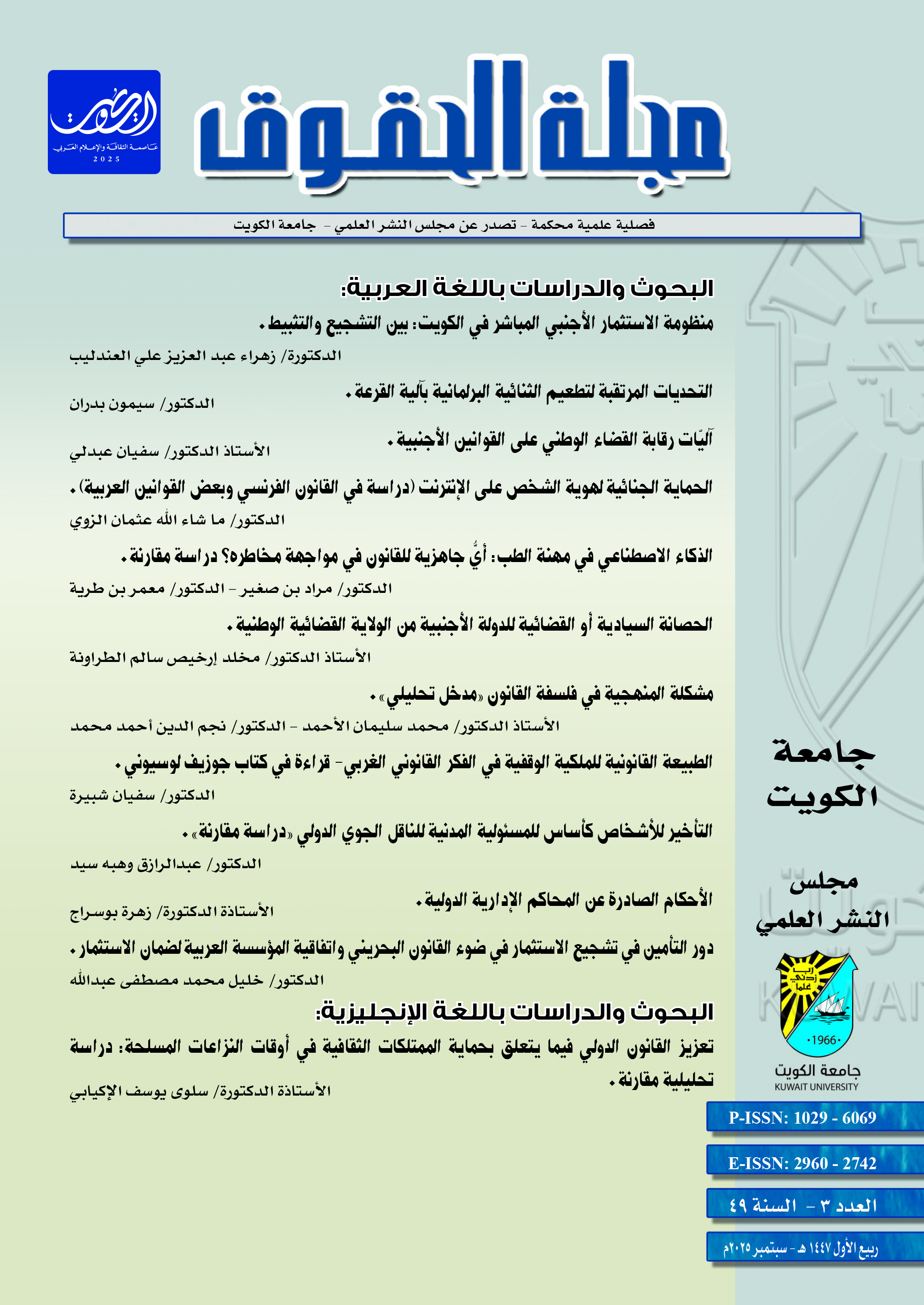 الأهداف: أهدف في هذه الورقة لبحث مدى كفاءةِ وتكاملِ القوانين المتعلقة بتشجيع الاستثمار الأجنبي المباشر في الكويت في تحقيقِ غاياتِها وذلك من ناحيتين: الأولى، تتعلقُ بمضمونِ القوانين المنظّمة للاستثمار المباشر، والثانية، تتصلُ بإشكاليةِ ضعفِ الضّماناتِ سواء المقرّرة لمصلحة المستثمر الأجنبي أو في مواجهتهِ. المنهج: وفي سبيلِ ذلك، أتبعُ منهجَ التحليل النقدي للتشريعات ذاتِ الصلة حسب أحدثِ تعديلاتها (القانون رقم 1 لسنة 2024)، إلى جانب النظرِ في الإجراءات والممارسات المتّبَعة في شأنِ ترخيص الاستثمار المباشر. النتائج: وقد خلصَ البحثُ إلى أن التشريعات المنظمة للاستثمار الأجنبي المباشر ما تزال غير كافيةٍ لاجتذاب المستثمرين بسببِ عددٍ من العوائقِ القانونية وغيرِ القانونية في بيئة الاستثمار. وفي المقابل، تفتقرُ التشريعات ذات الصّلة للضماناتِ الضرورية في مواجهةِ المستثمر الأجنبي لضمانِ التزامه وجديّتِه. الخاتمة: اختتم البحث بدعوة المشرّع الكويتي والإدارات المختصة بتطبيق قوانين الاستثمار الأجنبي لإجراء تعديلاتٍ قانونية أو لائحية لمعالجة العقبات التي تقف أمام المستثمر الأجنبي من ناحية، وللحد قدر الإمكان من عواقبِ التّضمين وعدم الالتزام من ناحية أخرى.