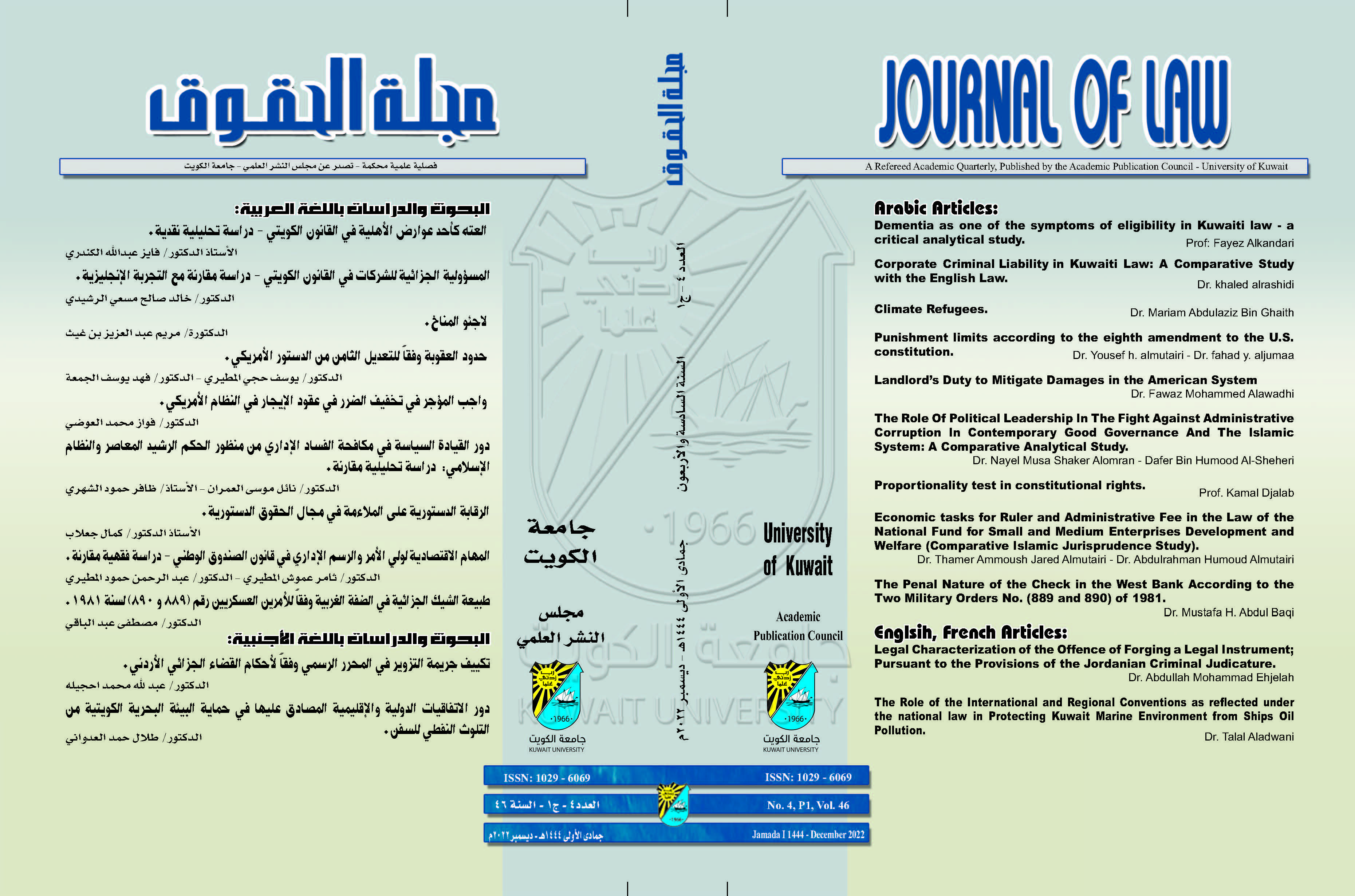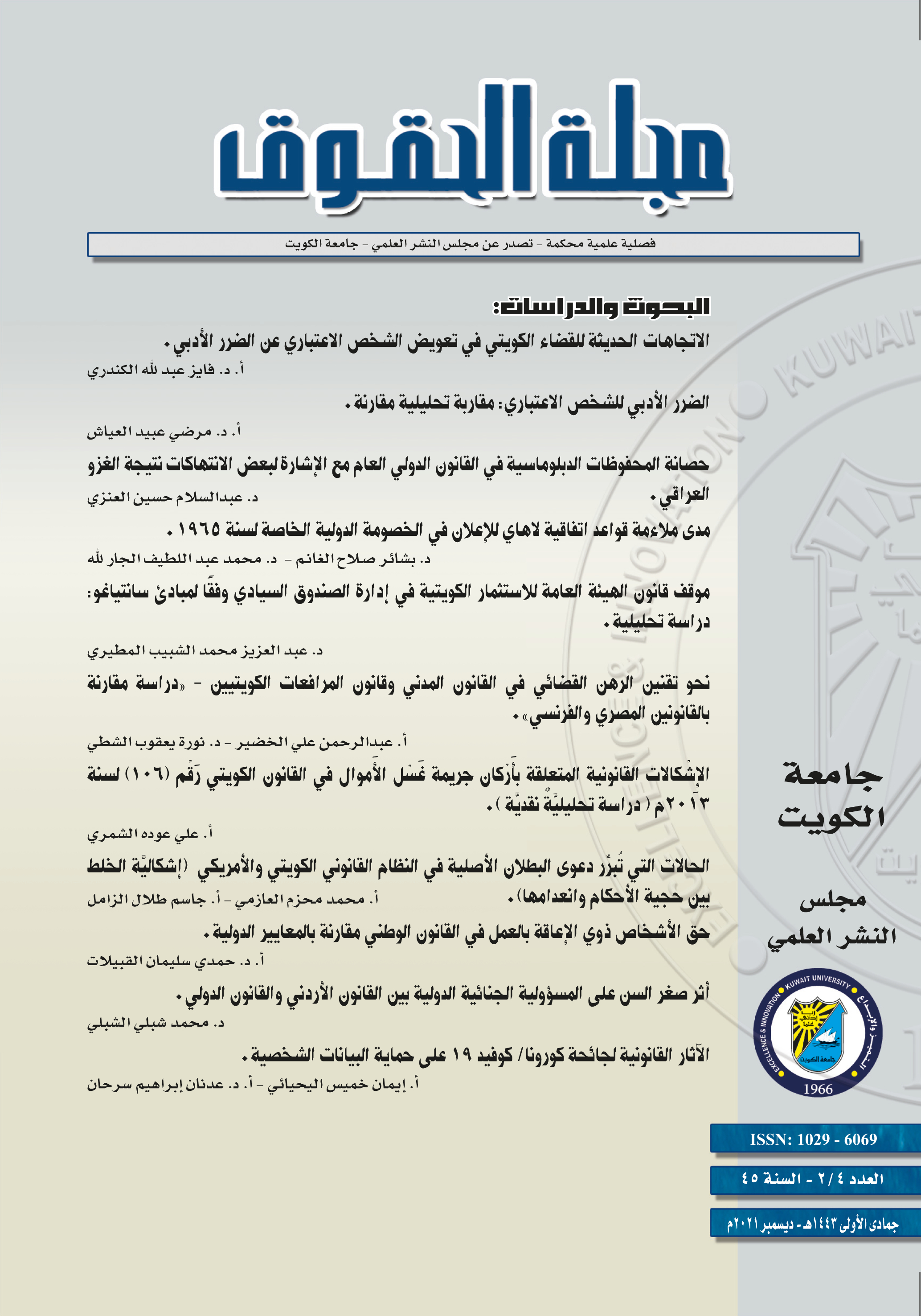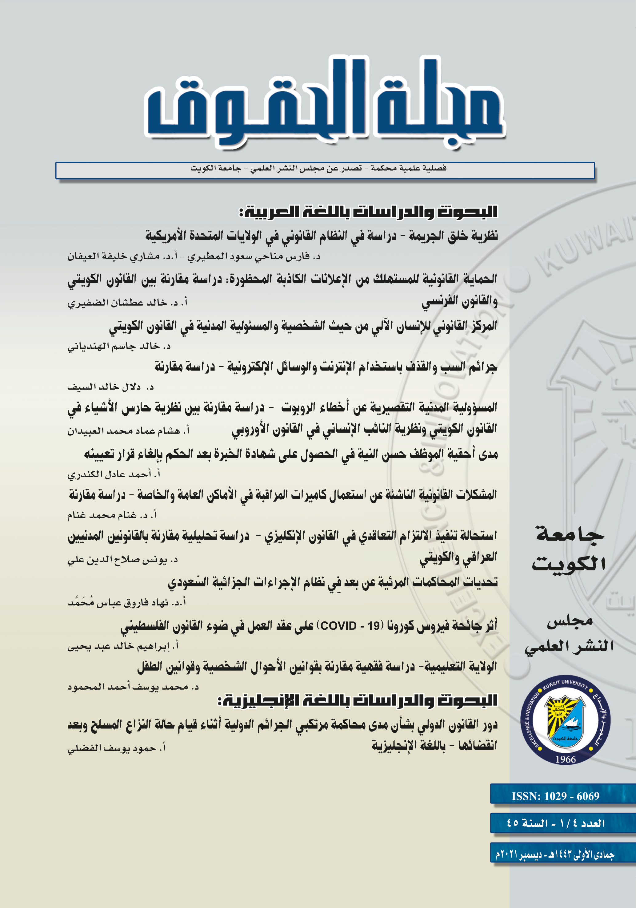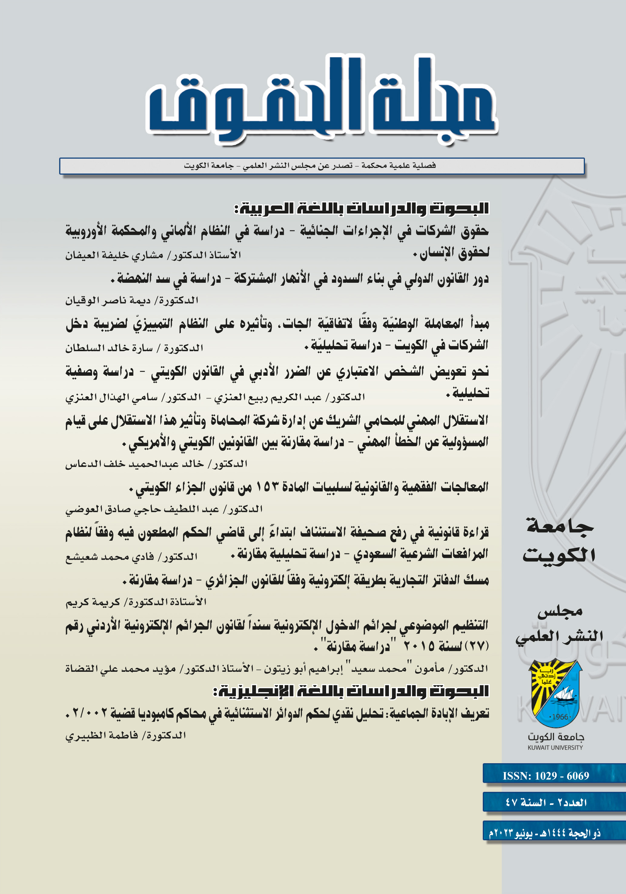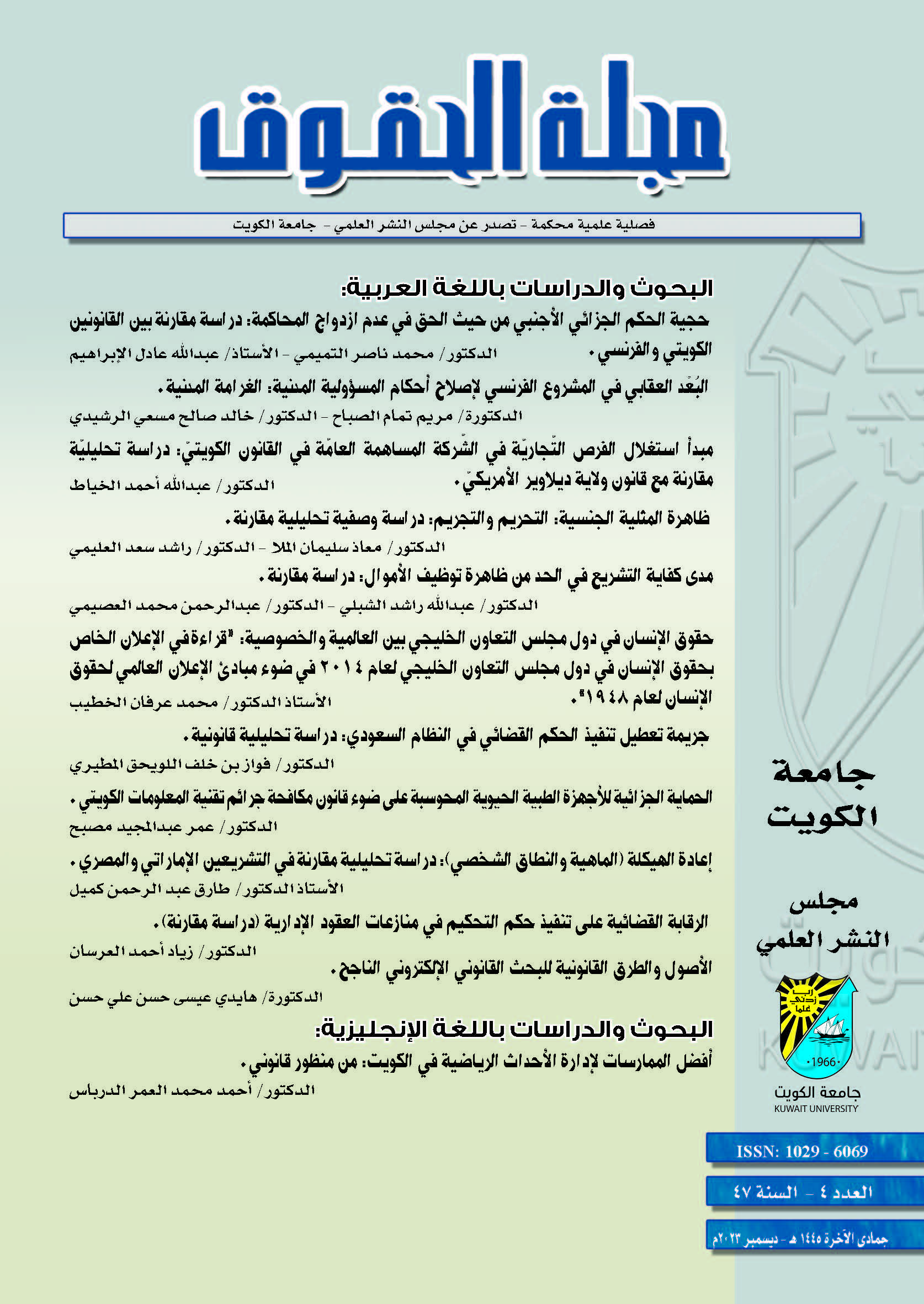 صدر عن مجلة الحقوق بجامعة الكويت العدد الرابع للسنة السابعة والأربعين ديسمبر 2023، وجاء العدد حافلاً بالبحوث والدراسات المتنوعة في معظم تخصصات القانون وفروعـه.