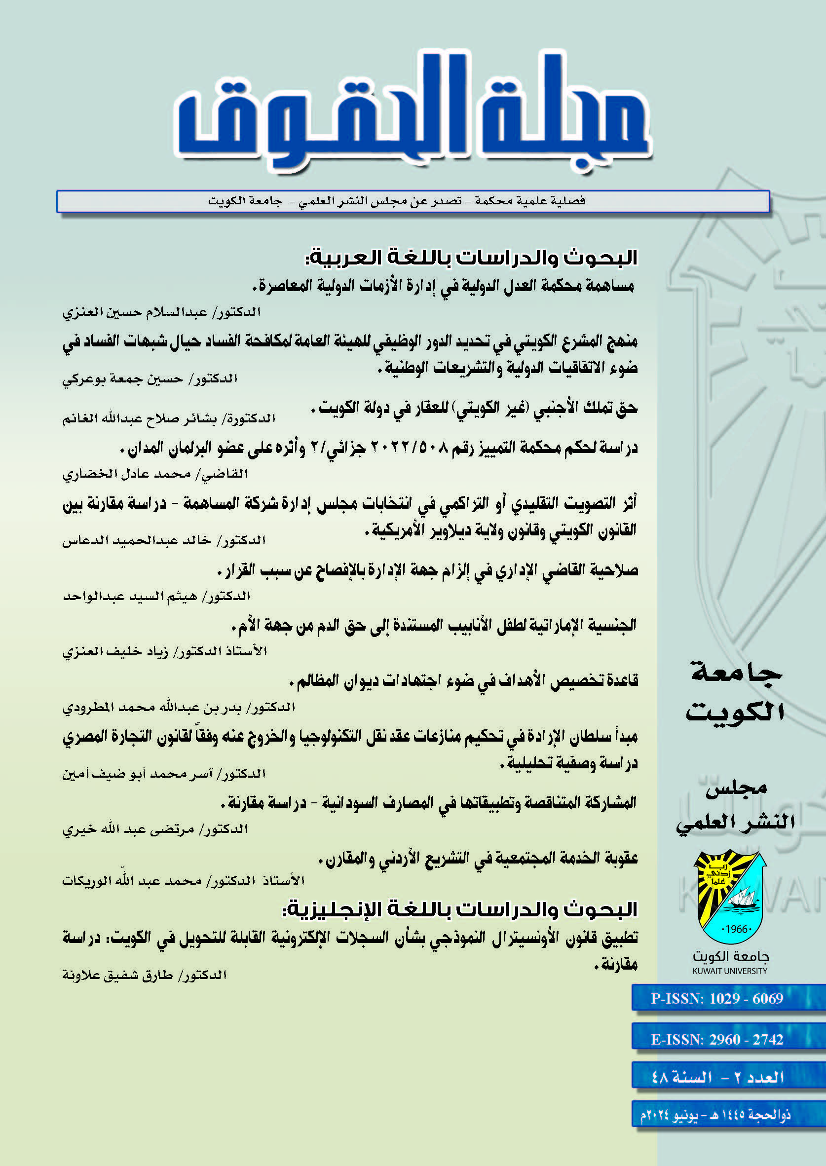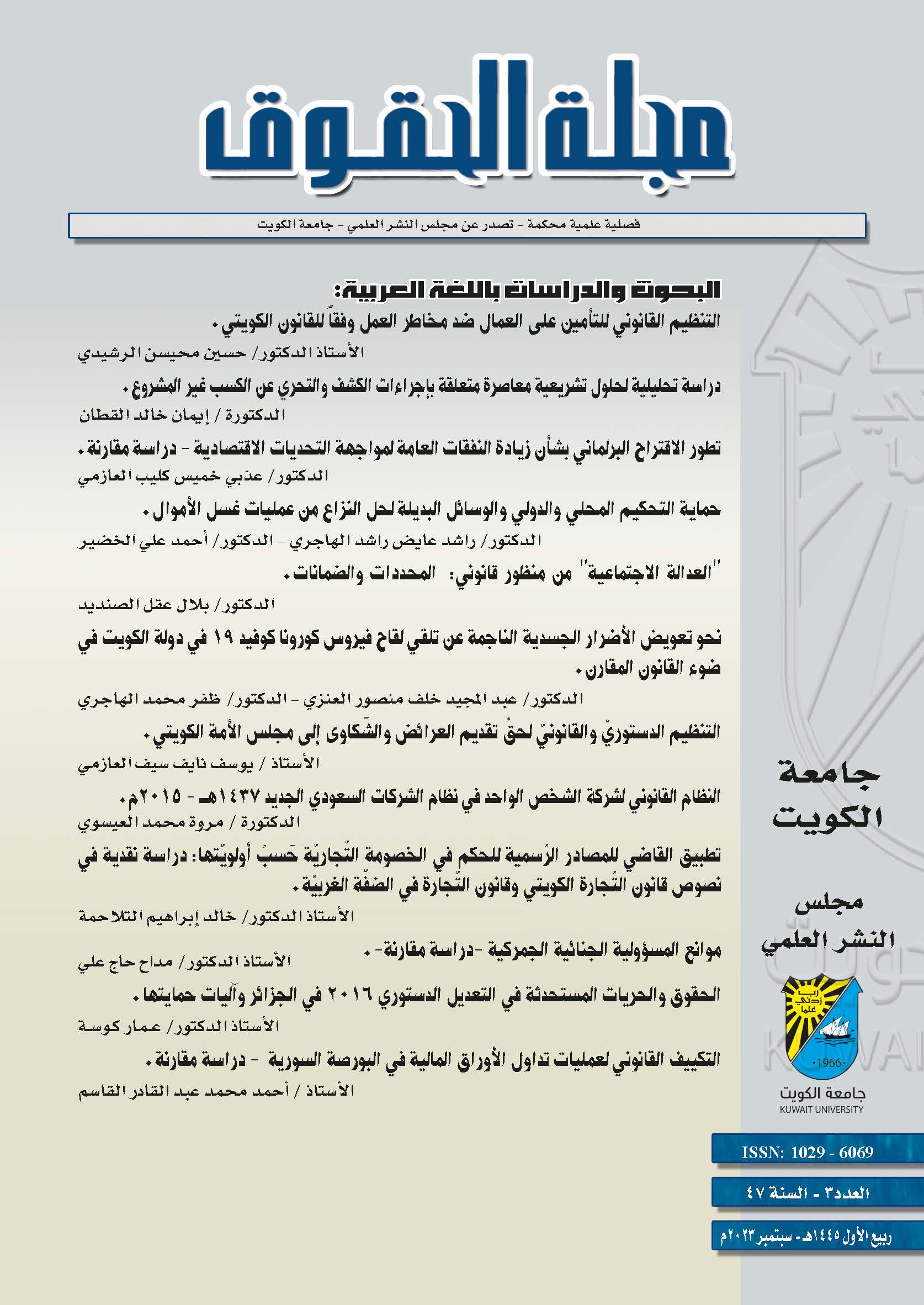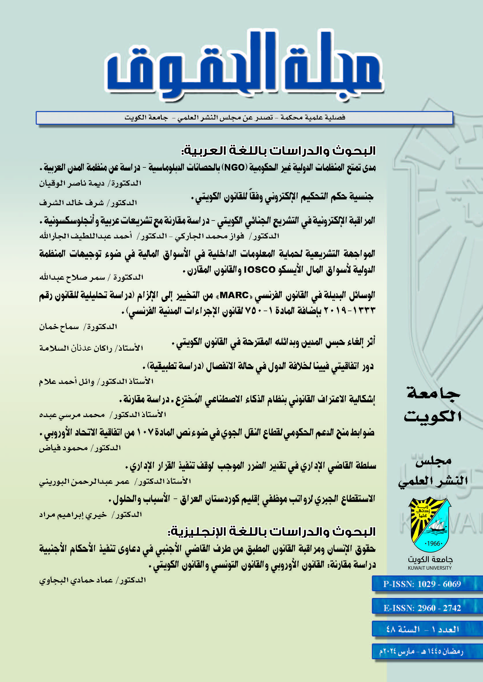صدر عن مجلة الحقوق بجامعة الكويت العدد الأول للسنة الثامنة والأربعين مارس 2024، وجاء العدد حافلاً بالبحوث والدراسات المتنوعة في معظم تخصصات القانون وفروعـه.