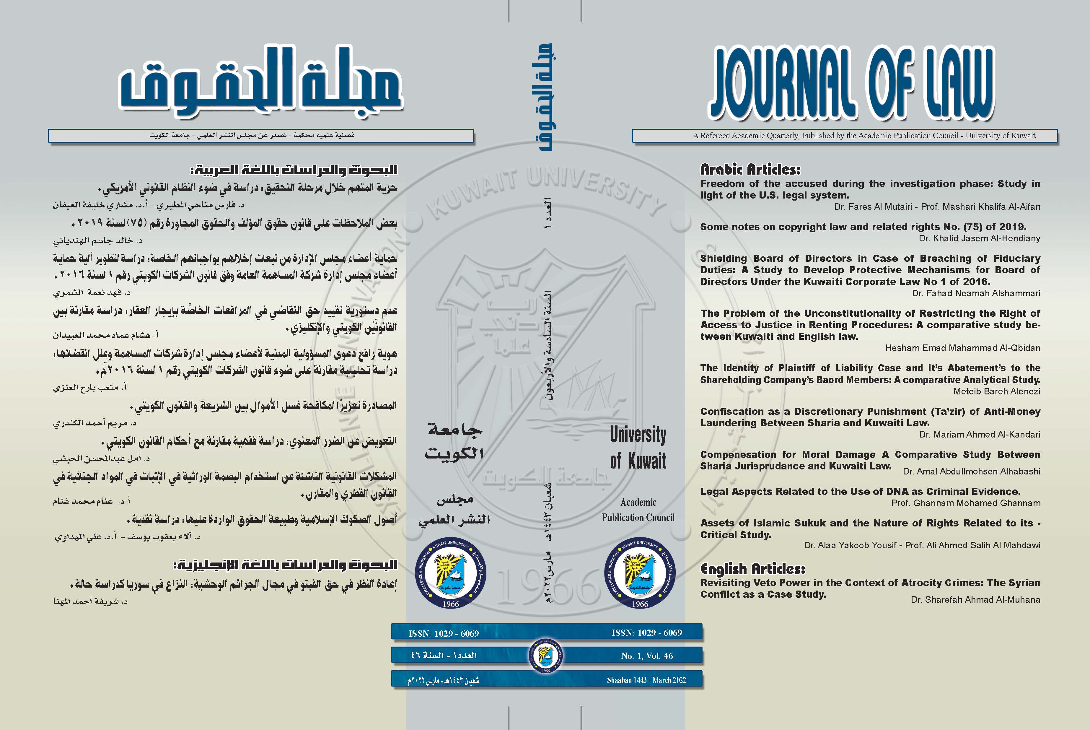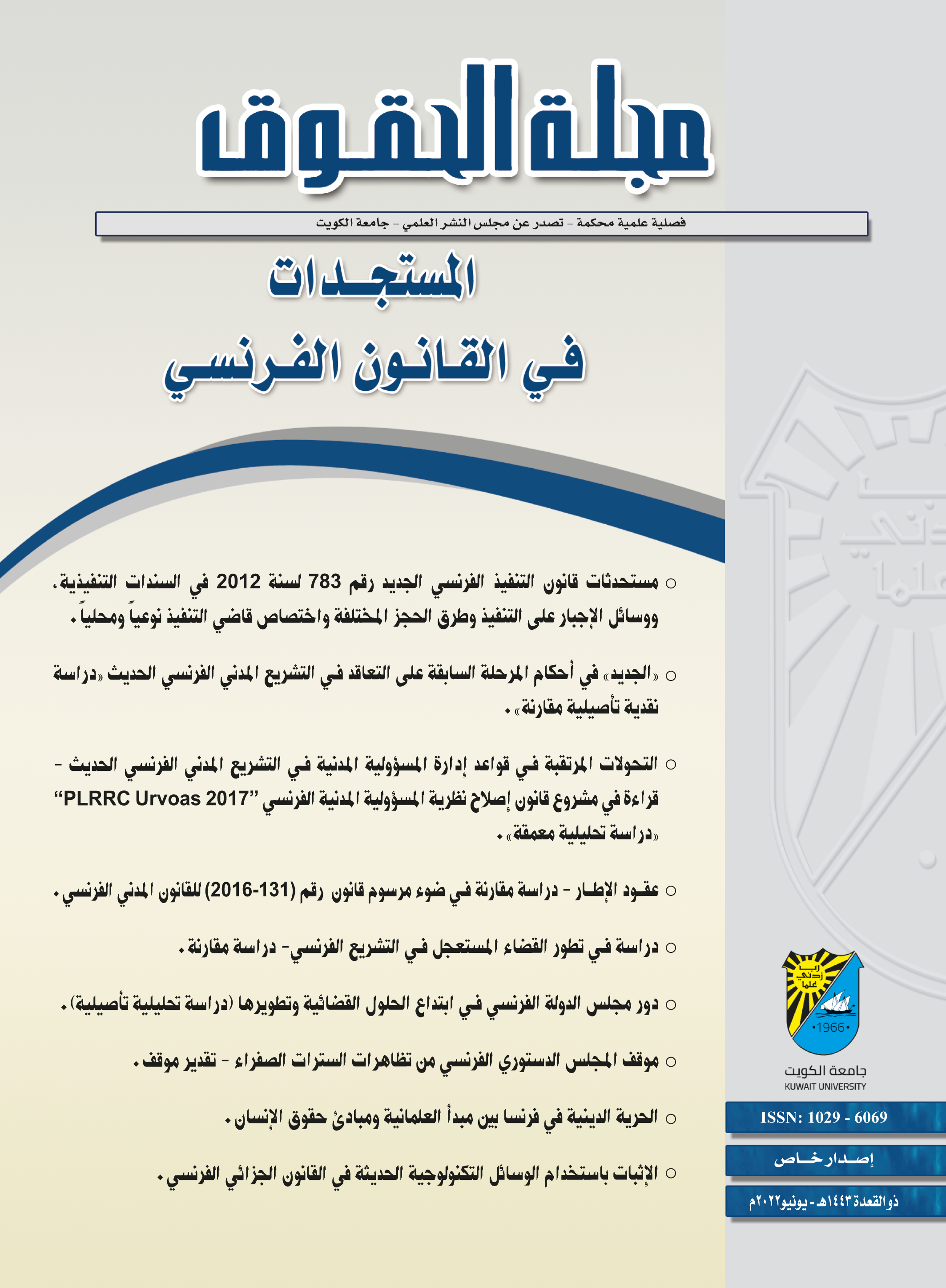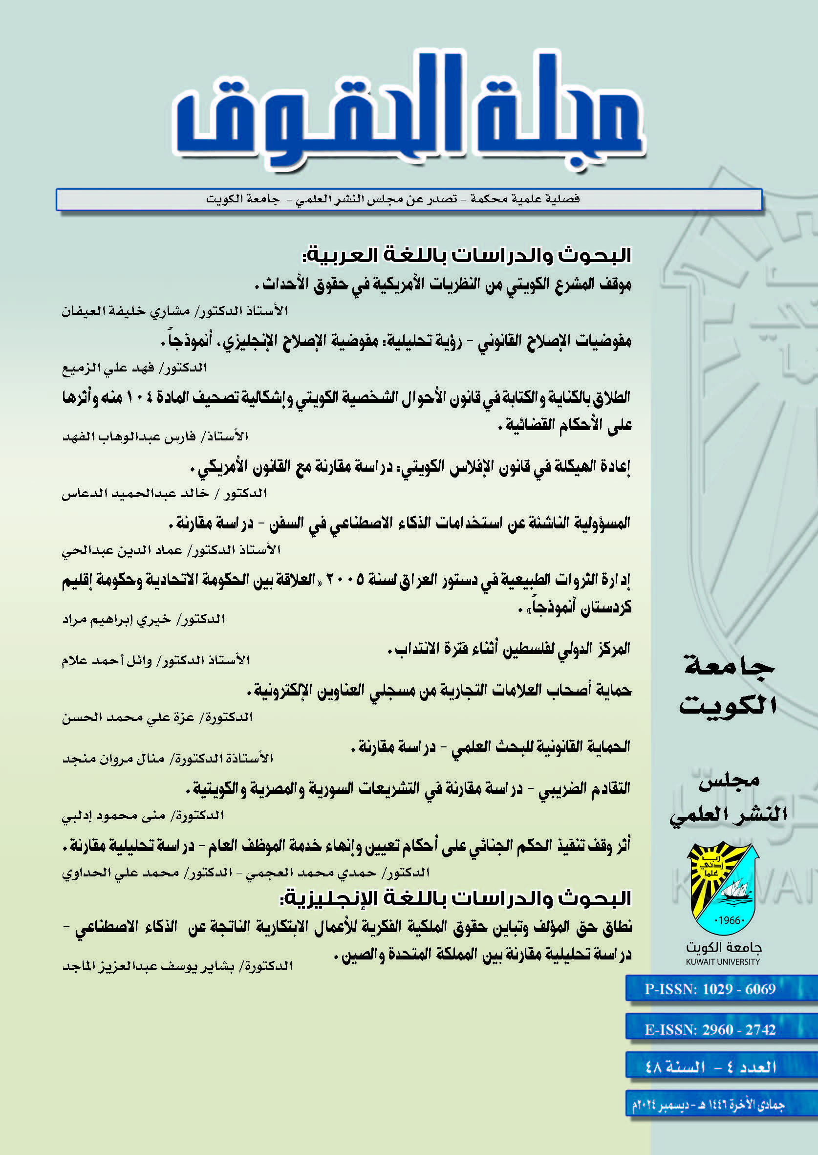صدر عن مجلة الحقوق بجامعة الكويت العدد الأول للسنة الثامنة والأربعين مارس 2024، وجاء العدد حافلاً بالبحوث والدراسات المتنوعة في معظم تخصصات القانون وفروعـه.