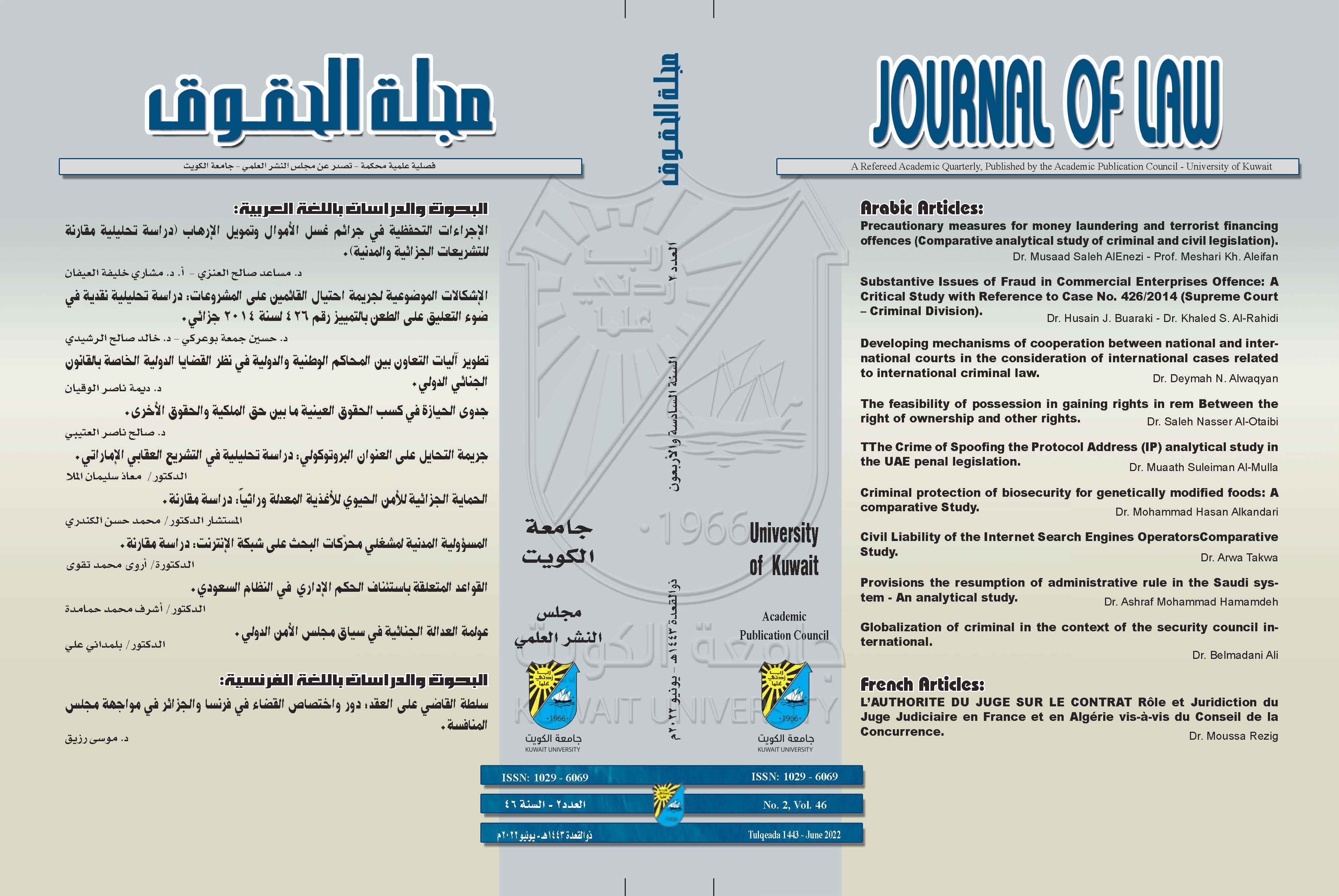 صدر عن مجلة الحقوق بجامعة الكويت العدد الثاني للسنة الثامنة والأربعين يونيو 2024، وجاء العدد حافلاً بالبحوث والدراسات المتنوعة في معظم تخصصات القانون وفروعـه .