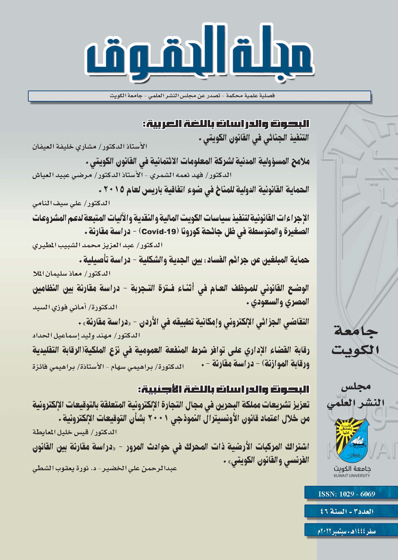 صدر عن مجلة الحقوق بجامعة الكويت العدد الثالث للسنة الثامنة والأربعين سبتمبر 2024، وجاء العدد حافلاً بالبحوث والدراسات المتنوعة في معظم تخصصات القانون وفروعـه.
