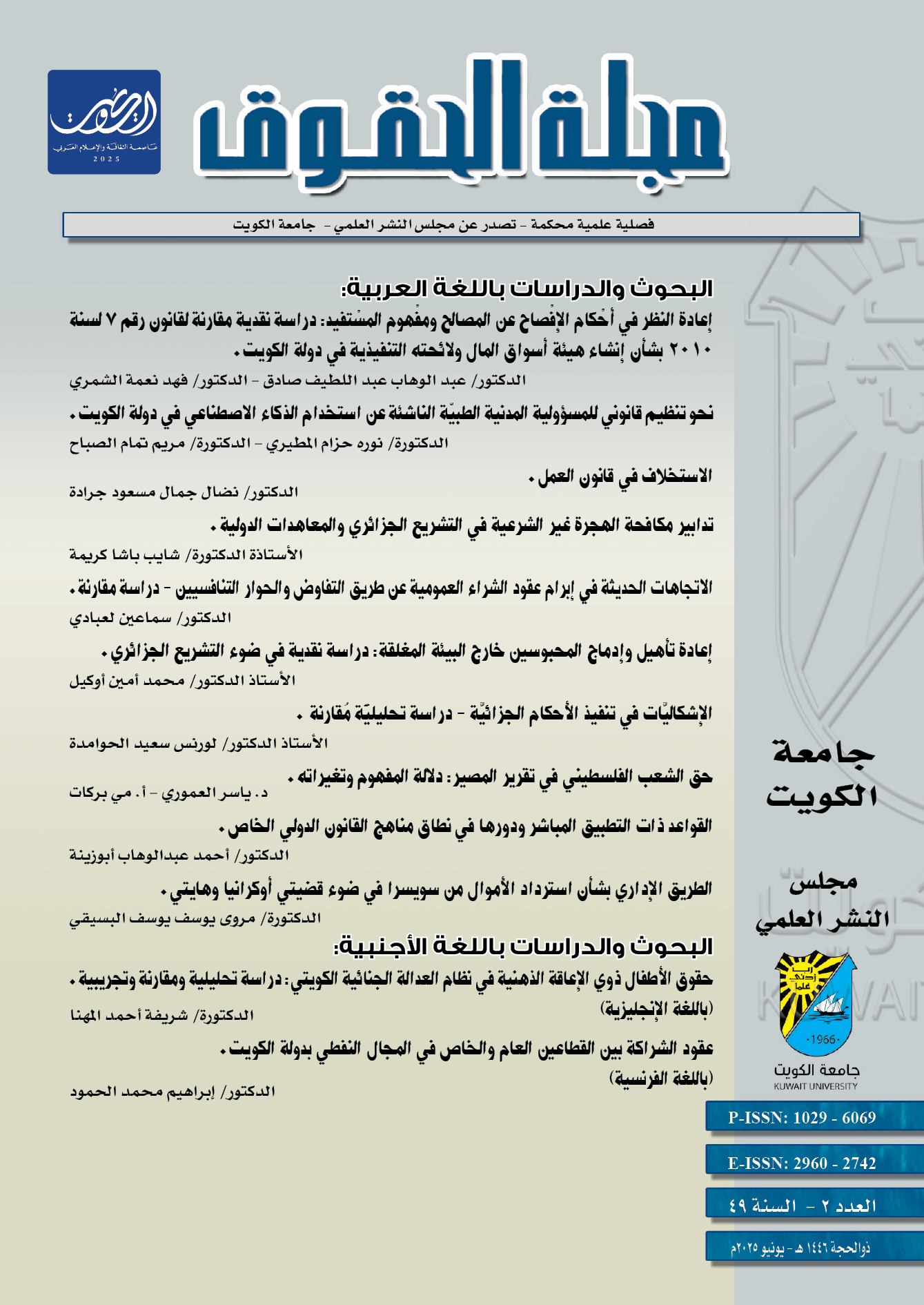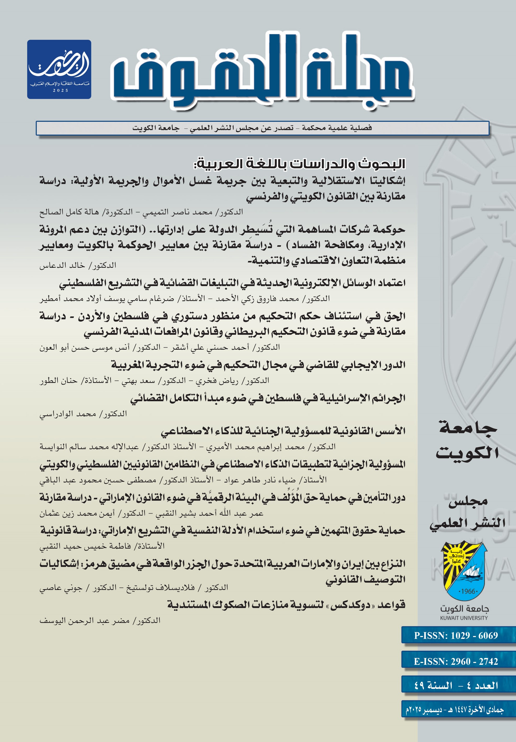انسجامًا مع رؤية هيئة تحرير مجلة الحقوق في دعم البحث القانوني وتعزيز مكانة جامعة الكويت في هذا المجال، يسرّ المجلة أن تقدّم عددها الصادر في ديسمبر 2025، والذي يضم مجموعة مختارة من الأبحاث الأصيلة التي تعالج قضايا قانونية معاصرة ترتبط بالتحولات التقنية والمؤسسية والجنائية والدولية، وتعكس تزايد ارتباط البحث القانوني بمتطلبات الواقع العملي.
